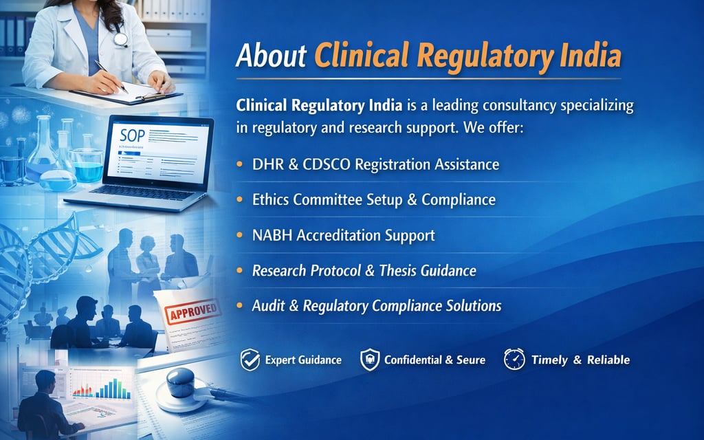 Clinical Regulatory India is a regulatory and academic consultancy led by Mr. Pushpit Singh, a clinical research professional with strong hands-on experience in ethics committee coordination, regulatory documentation, clinical research operations, and compliance processes. Through working with investigators, hospitals, research teams, and academic institutions, he has developed practical expertise in DHR registration, CDSCO regulatory processes, SOP development, NABH documentation, and research protocol guidance. Supported by a dedicated team handling documentation and research operations, the consultancy focuses on providing clear, practical, and compliance-oriented guidance. With growing experience and strong professional interactions with investigators, Mr. Pushpit Singh is committed to helping institutions solve regulatory and research queries efficiently, and visitors are welcome to directly connect for guidance or urgent queries. 📞 +91-8285115277.